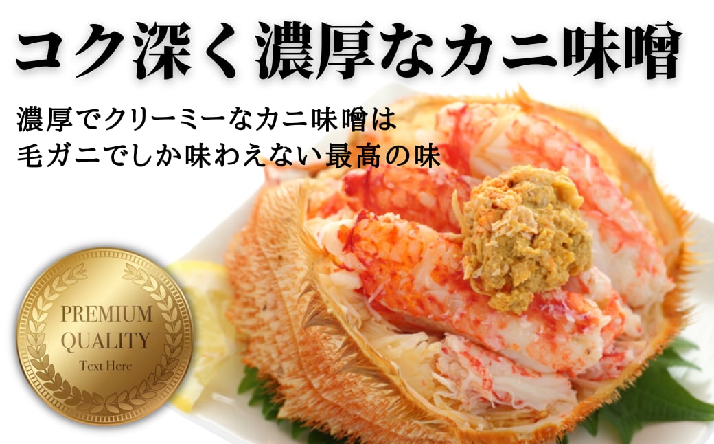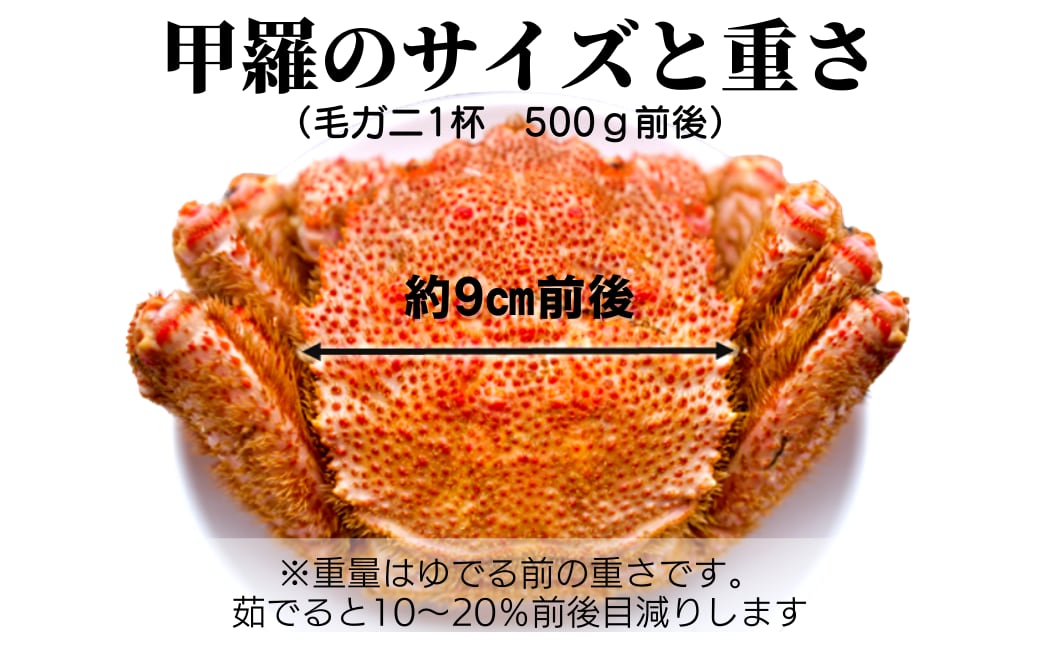 - 毛ガニは自然のものであるため、個体によりサイズや形状にはばらつきがあります。また、アレルギーの方は事前にご確認ください。