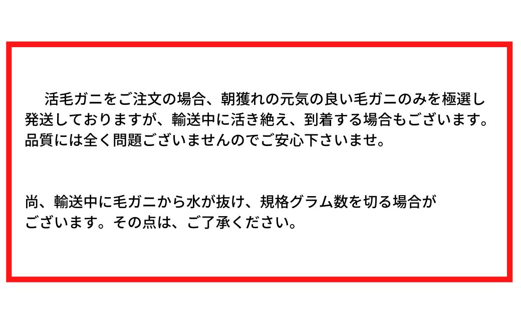 - 毛ガニは自然のものであるため、個体によりサイズや形状にばらつきがあります。また、アレルギーのある方は十分にご確認のうえご購入ください。